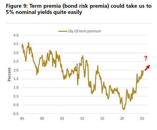 目前,期限溢价仅需上升50-60个基点就能将美债收益率推至5%。