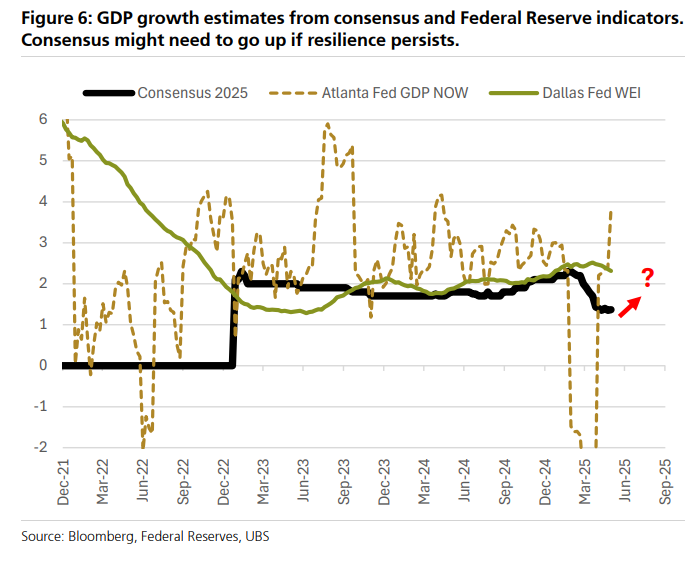 瑞银提出另一种乐观情景:亚特兰大联储GDPNow模型显示美国第二季度经济增速或达3.9%,叠加关税收入转化财政刺激、制造业回流政策见效,可能形成“增长-通胀-盈利”正向循环。